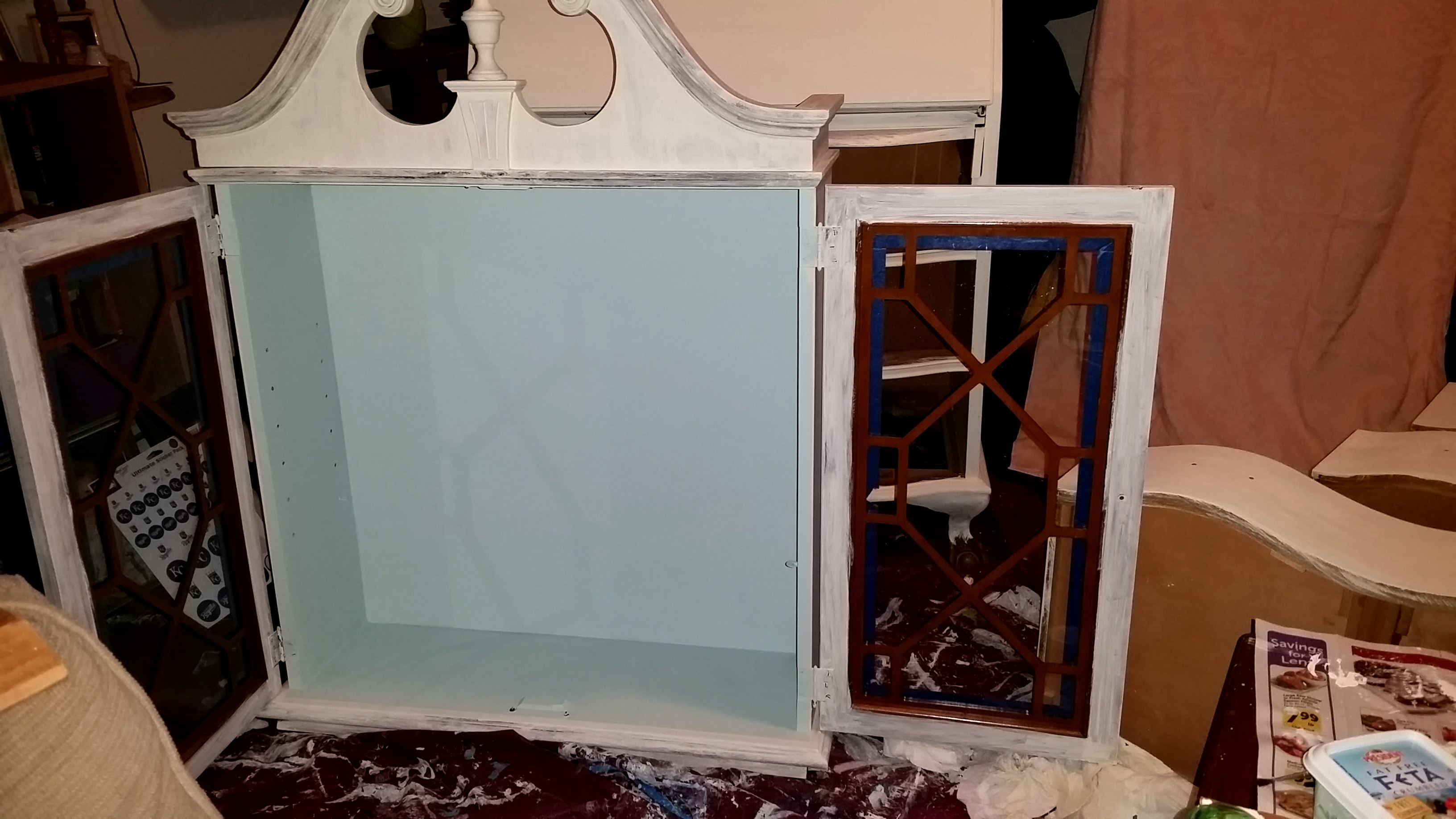 So I dove right in and the painting commenced. I mixed Annie Sloan Old White and Provence to make the color for the inside, and used Old White for the outside. Admittedly, I ran out of Old White, and finished with some brand of chalk paint from Michaels. I actually had to mix two different shades of the brand at Michaels to get the Old White shade. However, doing this turned out to be fine, and I couldn’t even tell the difference in colors. I applied several coats over about a week as I wasn’t going for the shabby-chic or worn look. When I was satisfied with how it looked, I applied several coats of wax, and voila! The only iffy part was the lattice on the glass of the doors. Seeing as it is on the inside, there wasn’t anything I could do about painting them so they remained the wood color. I thought perhaps they could be removed and put back in, but as I am no expert, I wasn’t going to take the chance of completely destroying them. I’m sure my Dad, who is in fact an expert at such things could have accomplished this, but 1600 miles keeps us from finding out.