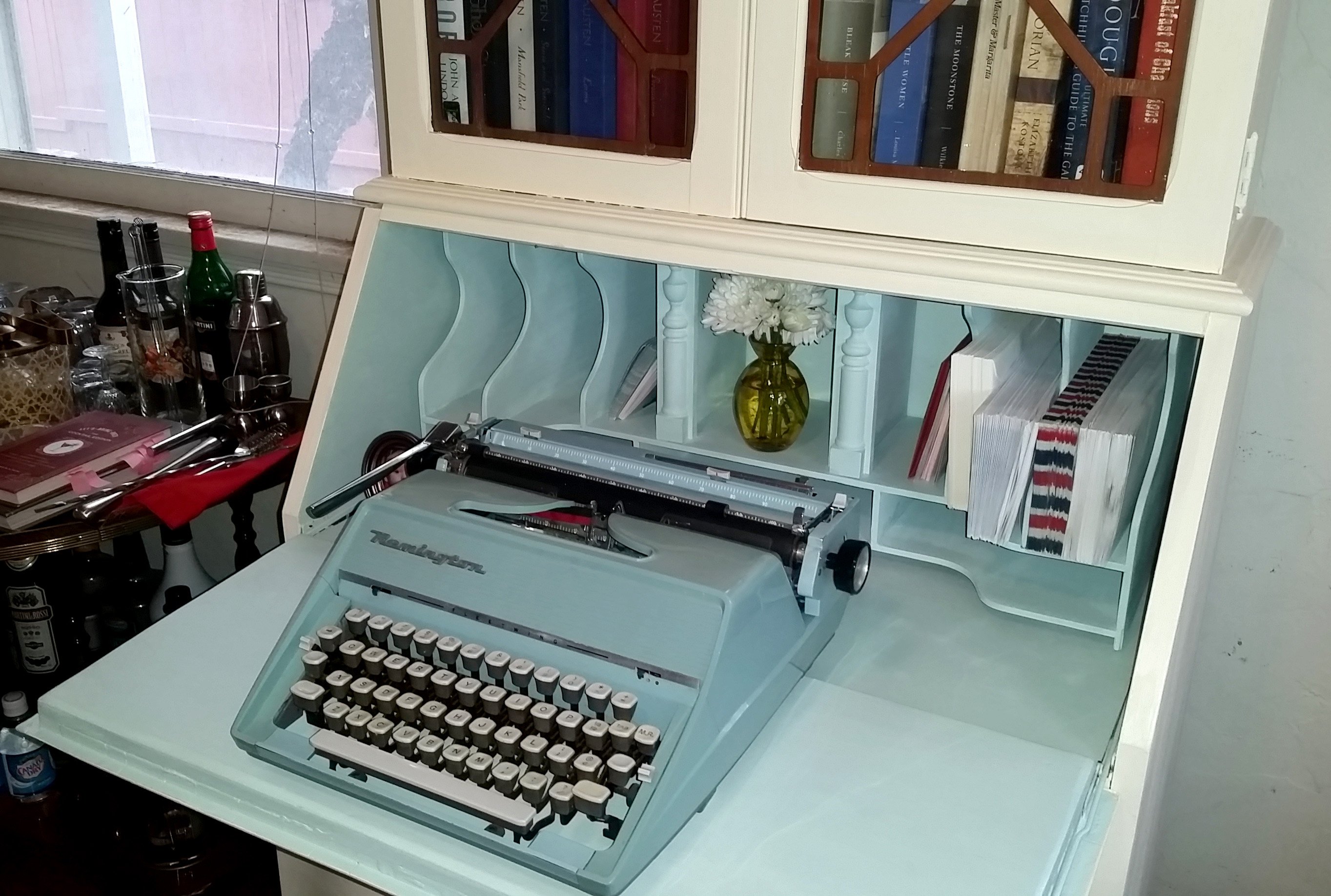 All that was left was to load it up with something. I decided books looked good in the hutch part, and the drawers provided a ridiculous amount of space for a variety of things. It wasn’t even my intention for it to so closely match my typewriter, but it worked out nicely. Eventually, I also found an old vanity stool that looks like it was made for it. And here she is today in all her glory.