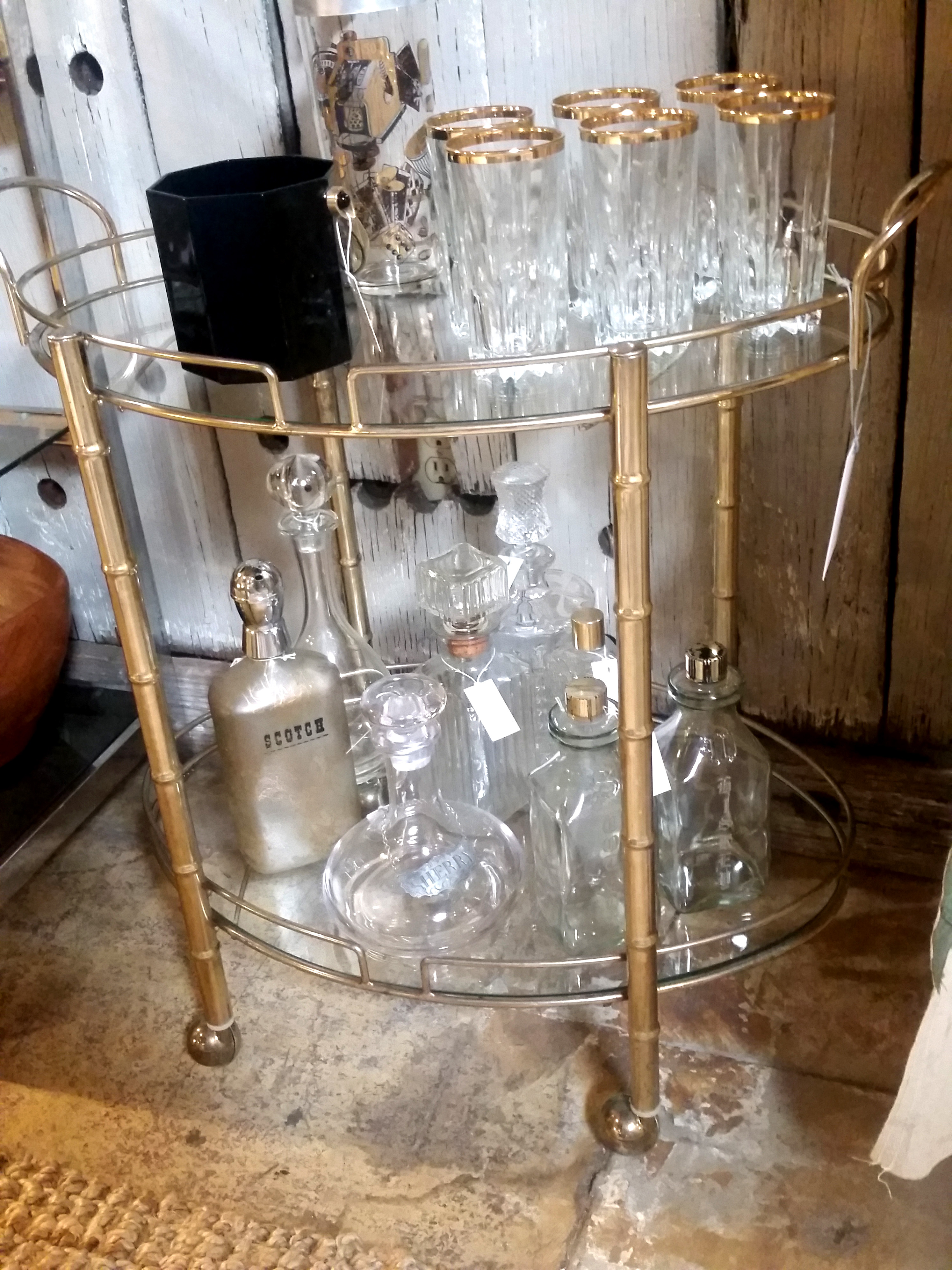 When I got the idea that I had to have a bar cart (or tea cart), the one I envisioned was brass with glass shelves. The initial search online brought up many options with those particular qualities, most with prices far out of my reach (this is an on going theme with me). I found one that Target carried that was within my price range and exactly what I had envisioned. . .except it was from the previous year, so they no longer had it available. If only I had started my search a year earlier, it would have been ideal. Not dwelling on it too long, the in person search commenced. Oh, were there some stunning options out there!